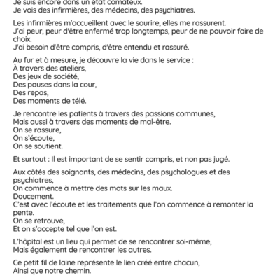 À travers cette exposition, le CH de Mâcon souhaite proposer un temps de réflexion et de sensibilisation, accessible à tous, autour de la santé mentale, du lien social et des moyens de le renforcer.