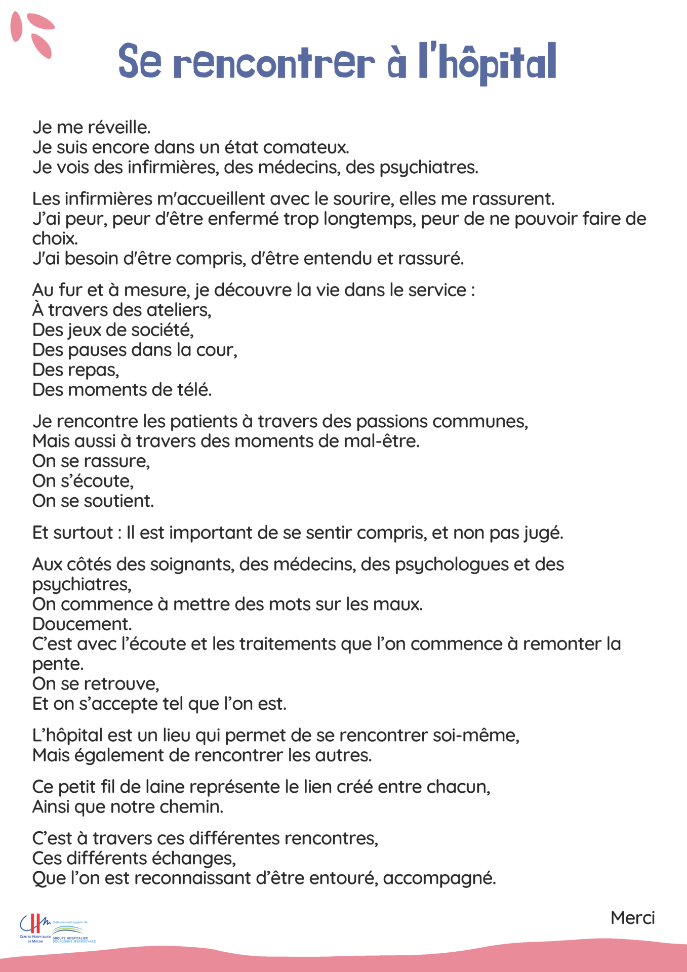 À travers cette exposition, le CH de Mâcon souhaite proposer un temps de réflexion et de sensibilisation, accessible à tous, autour de la santé mentale, du lien social et des moyens de le renforcer.